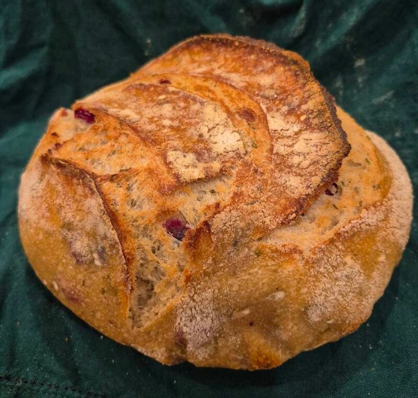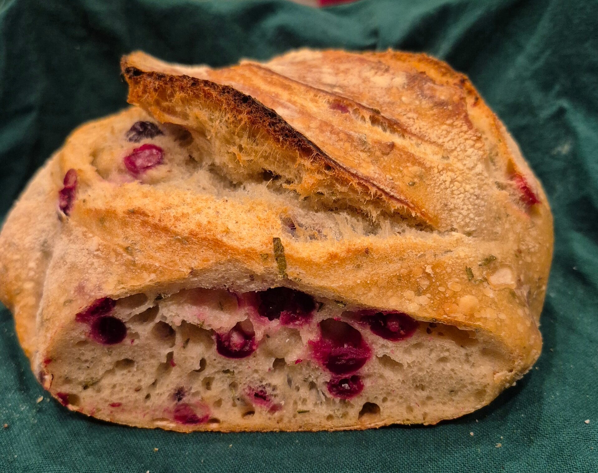 Organic wheat sourdough with whole cranberries and fresh chopped rosemary make this a bright, slightly tart, perfect accompaniment for a holiday meal.